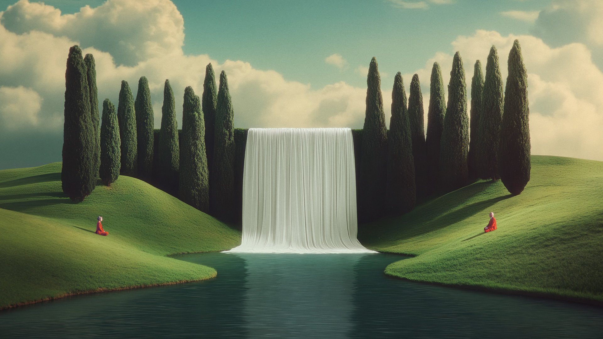 This piece captures the silent choreography of a relationship trapped in a power struggle. Within a landscape of rigid symmetry, two figures engage in a dialogue of gestures that never quite connect. Each movement is an act of self-assertion, swaying their shared world (symbolized by the cypresses) in a loop of sterile, perpetual motion. At the center, a cascade of fabric flows with indifference; a beautiful veil representing the growing distance between them. Ultimately, the composition reflects a stalemate rather than harmony. An equilibrium of opposing forces that leave the protagonists suspended in the echo of their own disconnection.